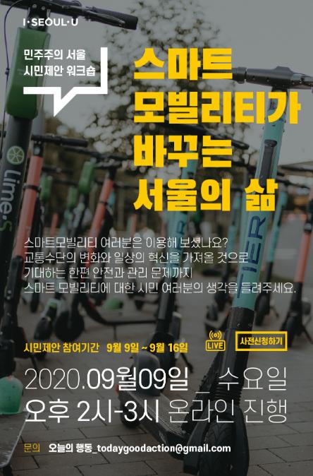사전신청은 이벤터스(https://event-us.kr/todaygoodaction/event/22116)를 통해 9월 9일 행사 전까지 신청가능하며, 워크숍 종료 후에도 9월 16일까지「민주주의 서울」플랫폼을 통해 제안에 참여할 수 있다.