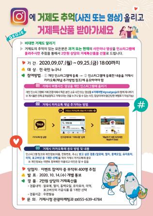 이벤트 기간은 2020. 09. 07일부터 09. 25일 18시가지이며, 참여방법은 거제시를 방문하여 기념으로 촬영한 과거의 사진 또는 현재의 사진, 영상을 두 가지(#거제여행, #greatgeoje)해시태그와 간단한 소감을 적어서 인스타 그램에 게시하고, 관련 링크와 개인정보(이름, 연락처, 경품받을 주소), 원하는 특산품을 적어 카카오톡 채널을 통해 응모하면 된다. 거제시 카카오톡에 제공되는 개인정보는 철저하게 보안된다.