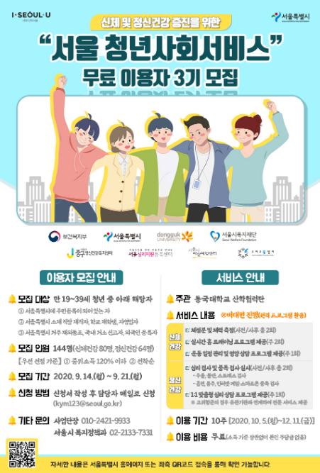 [한국4차산업신문] 서울시는 ‘서울 청년사회서비스사업단’에서 제공하는 신체 및 정신건강 증진 서비스를 10주(10~12월) 간 무료로 이용할 청년들을 14일(월)부터 모집한다.