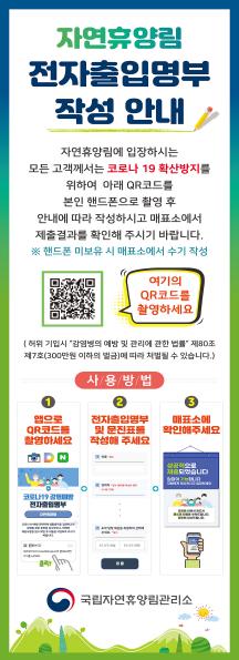 어플리케이션 다운로드 없이 국립자연휴양림에 비치된 QR코드를 스마트폰의 카메라나 포털사이트 어플로 촬영하면 전자출입명부 작성이 가능하다. 수집된 개인정보는 암호화하여 보관하며, 4주 뒤에 일괄 삭제된다.