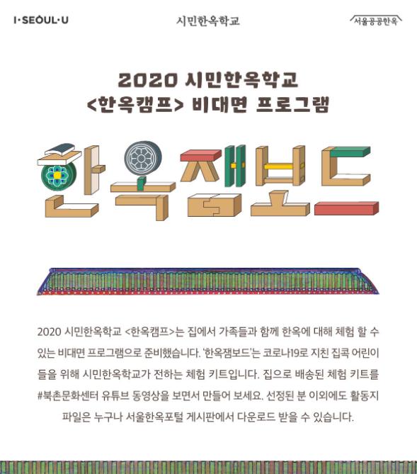 전통창살 만들기 교구를 제외한 ‘어린이 한옥건축캠프-한옥 잼보드’ 관련 활동지와 동영상은 서울한옥포털과 북촌문화센터 사회관계망을 통해 누구나 활용할 수 있도록 공개할 예정이라고 말했다.