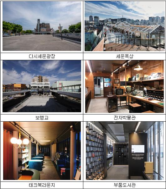산업재생 공간으로는 세운메이커스 큐브에 19개의 스타트업기업이 입주(‘17.9)해 활동하고 있으며, 세운전자박물관(‘18.4),테크북라운지(‘18.4), 부품도서관(‘19.5)등 공유 공간에 지역상인, 학생, 메이커, 시민 등 방문객이 월 평균 3,100명 정도 찾아오고 있다.