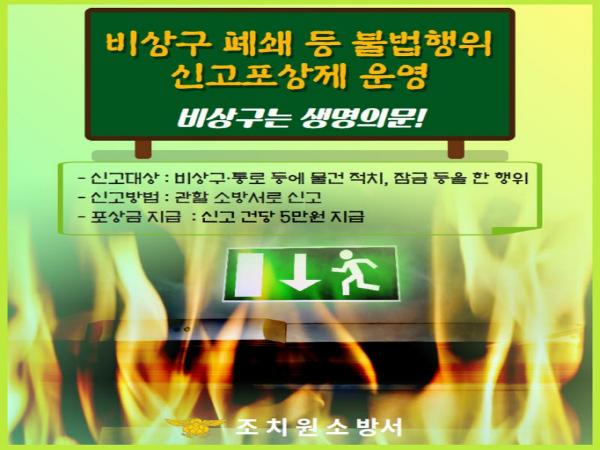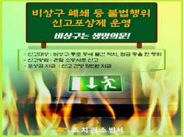 신고포상제는 소방시설 전원차단 및 방치, 비상구 폐쇄 등 불법행위에 대해 신고하는 시민을 대상으로 포상금을 지급하는 제도다.
