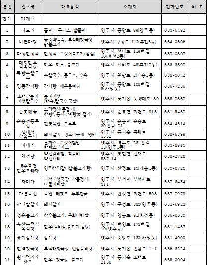 최종 영주맛집 선정은 1차 점수와 2차 점수를 합산해 20개소를 선정할 계획이었으나 공동 20등이 있어 최종 21개소를 선정했다.