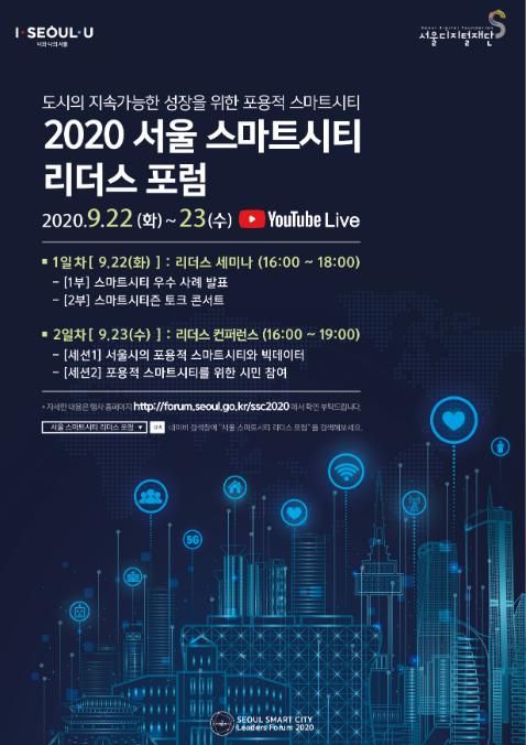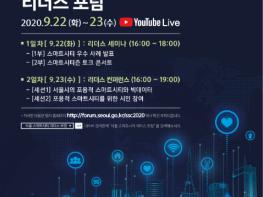 서울시는 ?2020 서울 스마트시티 리더스 포럼?을 9월22일(화)~23일(수) ‘무관중?온라인’으로 개최한다고 밝혔다. ‘포용적 스마트시티’를 주제로 미국 LA, 핀란드 헬싱키 등 11개국 도시와 스마트시티 분야 리더들이 ‘비대면’으로 만나 머리를 맞댄다.
