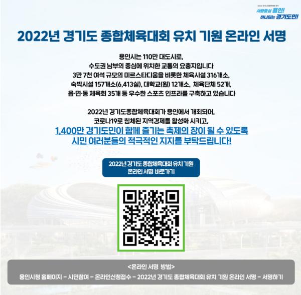 시 관계자는 "2022년 경기도 종합체육대회를 유치해 시의 훌륭한 인프라를 알리고 지역경제에 활력을 불어넣을 수 있도록 많은 분들이 온라인 서명운동에 동참해 주시길 바란다”고 말했다.