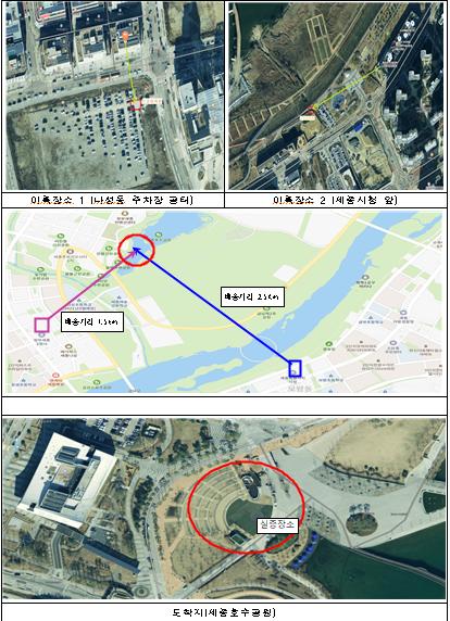 이번 실증에서는 5대의 드론을 2지역으로 나눠서 3대의 드론은 세종호수 공원에서 2.5km 거리에 있는 세종시청에서 출발하여 금강을 가로지르고, 2대의 드론은 1.5km 거리에 있는 나성동 상업지구의 고층빌딩 숲을 통과하여 마스크와 손세정제, 그리고 다양한 음식을 평균 10분 내에 배달하는 과정을 선보였다.