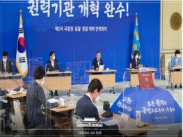 그런 뒤 대통령은 "우리는 그동안 각 기관의 권한을 조정하고 배분하거나 법과 제도를 일부 수정하는 정도가 아니라 국민을 위해 다시 태어난다는 각오로 권력기관 개혁을 추진해왔다"며 "남은 과제들의 완결을 위해 더욱 매진해야 한다"고 강조했다.