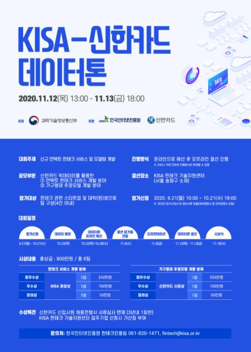 한국인터넷진흥원(KISA, 원장 김석환)은 과학기술정보통신부(장관 최기영), 신한카드(사장 임영진)와 함께 ‘KISA-신한카드 금융 데이터톤’ 대회를 개최한다고 9. 20일 밝혔다.