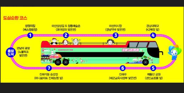 개편된 시티투어 2층버스는 오전 9시 20분, 10시 30분, 11시 40분, 12시 50분, 오후 2시, 3시 10분에 스포츠파크 만남의광장에서 출발하여 △창원의집 △마산상상길·창동예술촌 △마산어시장 △경남대학교 △제황산공원 △진해루 △하나로마트 진해농협을 거쳐 다시 만남의광장으로 돌아온다. 별도 예약 없이 정류장에서 탑승하면 된다.