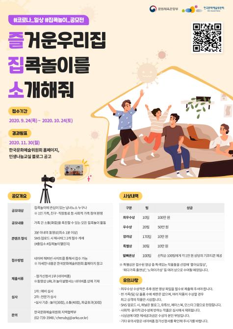 문화체육관광부는 한국문화예술위원회(위원장 박종관)와 함께 집콕놀이 공모전 ‘즐거운 우리집 집콕놀이를 소개해줘(즐집소)’를 9월 24일부터 10월 24일까지 개최한다. 이번 공모전은 온 국민이 처음으로 다 같이 집콕하는 시간들을 ‘문화를 즐기는 시간’으로 일구어 나갈 수 있도록 지원하기 위해 추진한다.