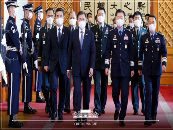 원인철 합동참모의장은 "대통령께서 말씀하신 ‘아무도 흔들 수 없는 나라, 흔들리지 않는 나라’를 만들기 위해 군심을 결집하겠다"며 "국군통수권자인 대통령님의 의지와 정부 정책을 강력한 힘으로 뒷받침하고, 신명을 다 바쳐 소임을 완수하겠다"고 다짐했다.