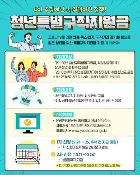 코로나19로 인한 채용 축소·연기, 구직기간 장기화 등으로 힘든 청년을 위한 ‘청년특별구직지원금’을 지원한다.