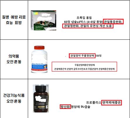 주요 적발사례로는 ▲관절염 예방(통증 완화) 등 질병 예방·치료 표방 81건 ▲퇴행성 관절염약 등 의약품 오인·혼동 광고 22건 ▲면역증진 강화, 항산화 작용 등 건강기능식품 오인·혼동 광고 25건 ▲사포닌(항산화, 항노화, 항당뇨, 간기능 개선) 등 제품에 함유된 성분의 효능·효과를 제품의 효능·효과로 오인하게 하는 소비자기만 광고 11건 등이다.