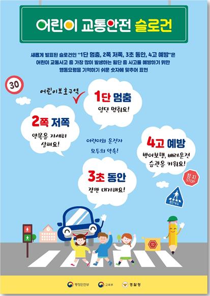 새롭게 발표된 슬로건인 “1단 멈춤, 2쪽 저쪽, 3초 동안, 4고 예방”은 어린이 교통사고 중 가장 많이 발생하는 횡단 중 사고를 예방하기 위한 행동 요령을 기억하기 쉬운 숫자에 맞추어 표현했다.