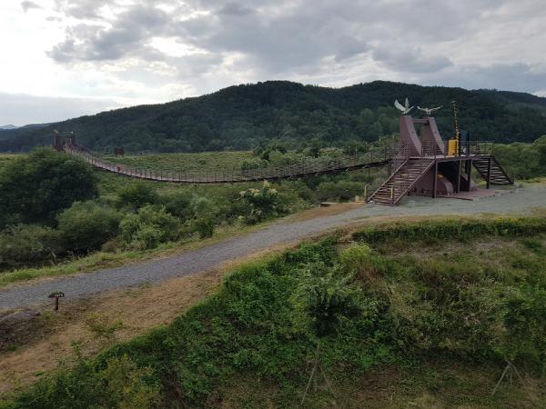 가을바람 맞으며 탐방로를 거닐다 보면 산밖벌 끝머리 제방 쪽 토평천 하류에 설치된 길이 98.8m, 보행폭 2m의 우포출렁다리(창녕군 이방면 옥천리 756번지)가 나온다.