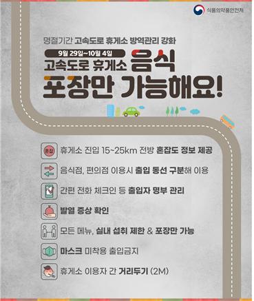 이의경 처장은 이날 방역현장에서 “국민이 안전하게 고속도로 휴게소를 이용할 수 있도록 코로나19 감염 차단에 힘써 주시고,더불어, 고속도로 휴게소는 현재 192개소 내 1,402개 음식점이 위생등급 지정업소인 만큼, 앞으로도 방역관리 뿐만 아니라 식품 위생수준 향상을 위해서도 지속 노력해 달라“고 당부하였다.