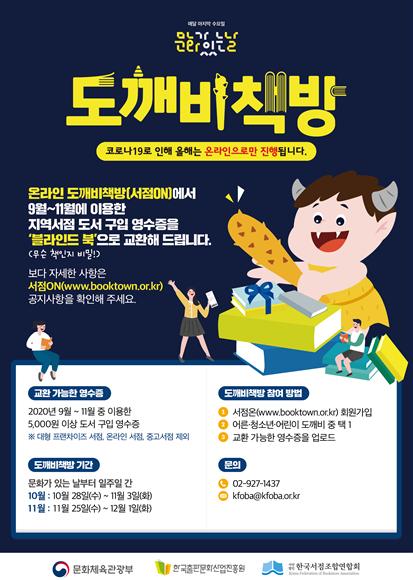 ‘2020 도깨비책방’은 10월~11월 마지막 주 문화가 있는 날(수요일)부터 1주일* 동안 열린다. 지역서점 누리집 ‘서점온(서점ON, www.booktown.or.kr)’에 가입한 후 도서 구입 영수증을 인증하면 무료로 책을 교환해 받아볼 수 있다. 이번 행사는 준비된 도서가 소진될 때까지 선착순으로 진행된다.