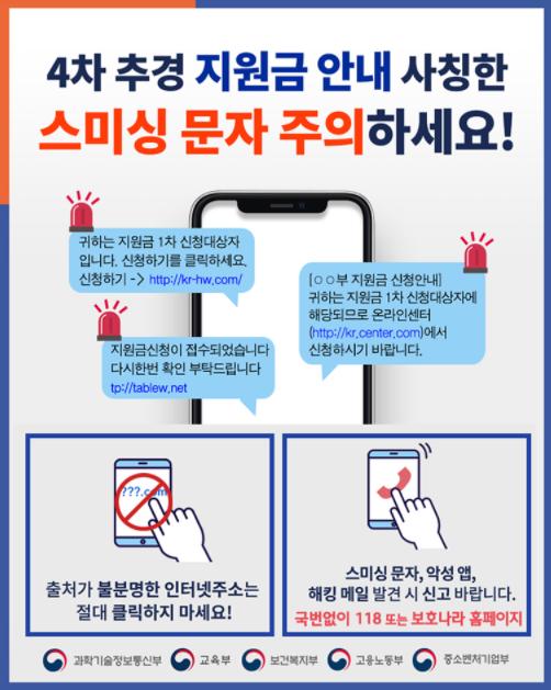[한국4차산업신문] 지원대상이 아닌 이용자가 문자를 받은 경우는 클릭하지 말고 바로 삭제하고, 지원 대상자는 스미싱 문자인지 여부 확인 등 URL 클릭에 세심한 주의가 필요하다.