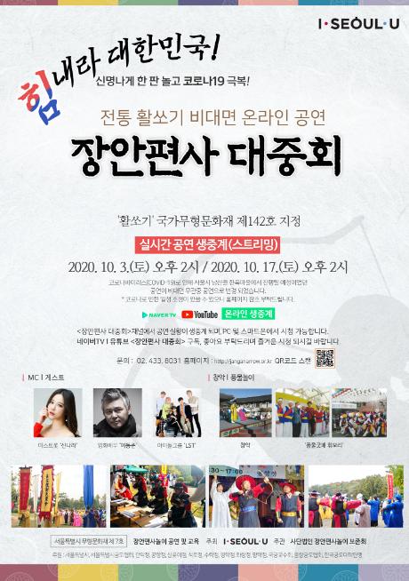 공연은 코로나19 확산 방지를 위해 ‘무관중-온라인’ 공연으로 진행되며, 추석 연휴인 10월 3일(토) 오후 2시와 10월 17일(토) 오후 2시, 2회에 걸쳐 네이버TV와 유튜브에서 생중계 된다. 공연과 관련된 자세한 내용은 홈페이지(http://www.janganarrow.or.kr/)및 유선전화(02-733-2469)로 확인할 수 있다.