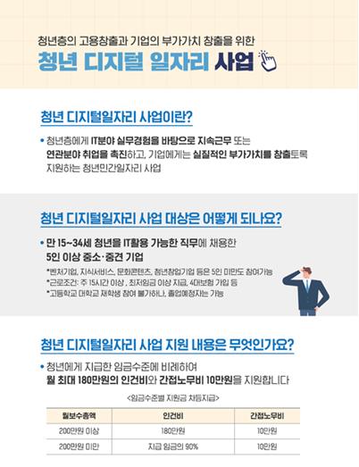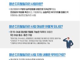 청년 디지털일자리 사업은 청년층에게는 IT분야 실무경험을 바탕으로 지속적으로 근무하거나 연관 분야에 취업할 수 있는 기회를 제공하고, 기업에게는 유능한 인재 고용으로 실질적인 부가가치를 창출할 수 있도록 지원하는 청년 민간 일자리사업이다.