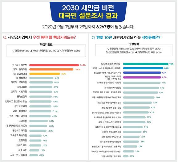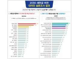 새만금개발청(청장 양충모)은 9월 9일부터 23일까지 「국민이 함께 열어가는 2030 새만금 비전」이라는 주제로 새만금의 향후 10년의 핵심어(keyword)와 성장동력을 묻는 설문조사(총 6,267명이 참여) 결과, 이같이 응답했다고 밝혔다.