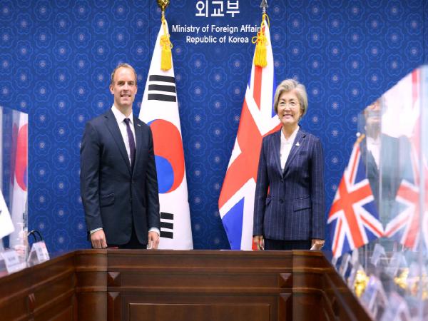 [한국4차산업신문] 강경화 장관은 우리나라를 방문 중인 「도미닉 랍(Dominic Raab)」영국 외교장관과 9.29일 오전 11:30-14:30간 제5차 한-영 외교장관 전략대화를 개최하고, △실질협력 확대 등 양국관계 발전 방안 △코로나19 대응 △기후변화, 개발협력, 국제 경제통상 등 국제무대 협력 견인 △한반도 및 지역 정세 등에 대해 심도 있게 협의했다.