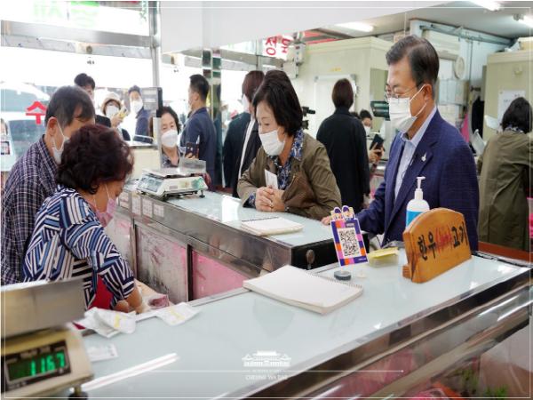 문재인 대통령은 김정숙 여사와 먼저 청과물시장에서 상인들을 격려하고, 과일을 구매한 뒤 온누리상품권으로 결제했다.