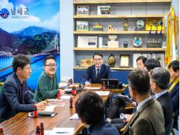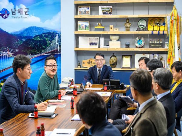 남해군이 지난 19일 오후 5시 군수실에서 장충남 남해군수를 비롯한 관계 공무원과 군의회 의원, 제작사 관계자 등 10여명이 참석한 가운데 남해대교 주제영상 제작보고회를 열었다.