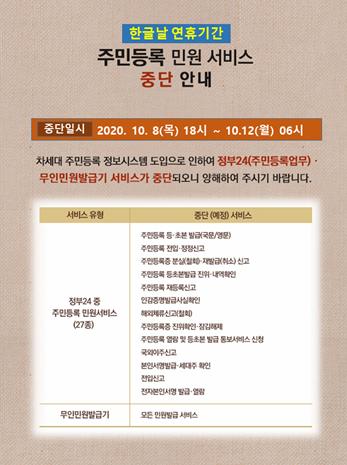 이에 한글날 연휴기간 전·후인 10월 8일 18시부터 10월 12일 06시까지 주민등록 등·초본 발급ㆍ주민등록 전입신고 등 주민등록 관련 서비스가 중단된다.