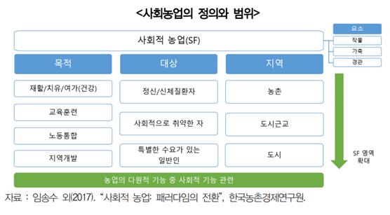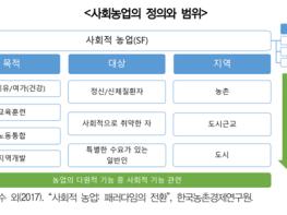사회농업은 농업에 내재한 다양한 기능을 활용해 사회에서 배제된 사람들에게 서비스를 제공하고, 사회 안으로 끌어들여 사회통합을 촉진하는 실천적 농업을 의미한다. 여기에는 농업을 활용해 정신질환자, 고령자, 장애인 등에게 돌봄 및 교육 서비스를 제공하고 일자리와 새로운 소득원을 창출하는 일련의 농업활동을 포함한다.
