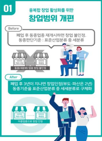 예컨대, 기존에는 다른 기업의 공장을 인수해 사업을 개시한 경우 창업으로 인정하지 않던 것을 다른 사람이 신규 아이템으로 새로운 사업을 개시할 경우 창업으로 인정하고,중소기업이 폐업 후 동종 업종으로 사업을 개시하는 경우에 평생 창업으로 인정하지 않던 것을 3년(부도·파산은 2년) 이후 사업을 개시할 경우는 창업으로 인정하도록 했다.