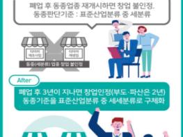 디지털 경제 시대를 맞아 연쇄창업과 융복합 형태의 다양한 사업모델 등을 창업으로 인정하기 위해 동종업종의 판단기준을 표준산업분류상 기존의 ‘세분류(4번째 자리)’에서 ‘세세분류(5번째 자리)’로 개편해 창업으로 인정되는 경우를 확대했다.