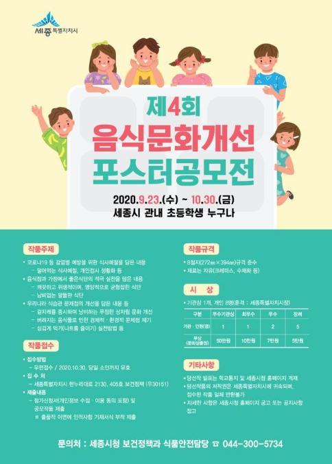 [한국4차산업신문] 세종특별자치시가 오는 30일까지 세종시 소재 초등학교 학생을 대상으로 ‘제4회 음식문화개선 포스터 공모전’을 개최한다.