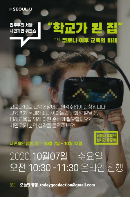 [한국4차산업신문] 서울시는 10월 7일(수) 오전 10시 30분 ‘학교가 된 집 : 코로나 이후 교육의 미래’에 대한 시민의 다양한 제안을 발굴하기 위해, ‘온라인 시민제안 워크숍’을 개최한다.