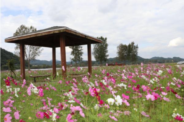 [한국4차산업신문] 부여군 백마강 둔치에 코스모스가 만개하여 가을의 정취를 물씬 풍기고 있다.