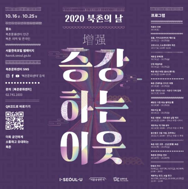 [한국4차산업신문] 서울시와 사)문화다움은 10월 16일(금)~25일(일) 열흘간, ‘증강(增强)하는 이웃’을 주제로 코로나19로 지친 북촌 주민과 시민들에게 안부를 전하며 소통과 유대를 강화하는 ?2020 북촌의 날? 행사를 개최한다.