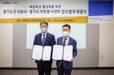 경기도주식회사는 지난 8일 경기도자원봉사센터와 ‘배달특급 청년봉사자 서포터즈 업무협약(MOU)’을 맺고 ‘배달특급’ 홍보 활성화에 두 기관의 역량을 모으기로 했다.