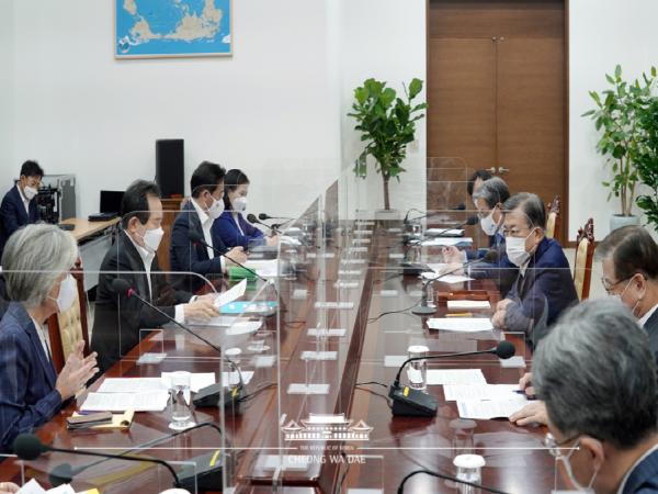 오전 11시부터 1시간 동안 진행했다. 참석 멤버는 한국인으로는 사상 처음으로 WTO 최종 결선에 진출한 유명희 통상교섭본부장을 비롯해 정부 측 정세균 국무총리, 강경화 외교부 장관, 성윤모 산업부 장관, 구윤철 국무조정실장, 청와대의 노영민 비서실장, 김상조 정책실장, 서훈 국가안보실장, 김현종 국가안보실 2차장 등이다.