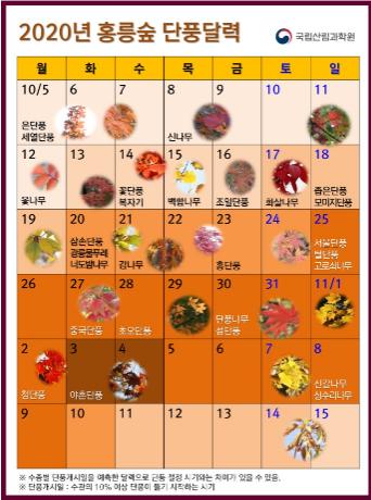 [한국4차산업신문] 산림청 국립산림과학원은 홍릉숲의 첫 단풍이 물들었음을 알리며, 서울 홍릉숲 내 다양한 나무들의 단풍 개시일을 알려주는 '2020년 홍릉숲 단풍달력'을 발표했다고 밝혔다.