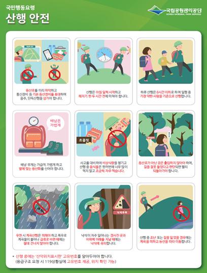 행안부는 산행 시에 기본적인 안전 수칙을 지키는 것이 무엇보다 중요하다고 강조하며 ?지정된 등산로 이용, ?보행주의, ?충분한 휴식 등을 당부했다.