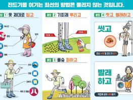 예방수칙은 ▲긴팔·긴바지, 모자, 목수건, 토시, 장갑, 양말, 장화 등 적정 작업복 착용 ▲기피제 뿌리기 ▲풀숲에 옷을 벗어 놓지 않기 ▲귀가 후 즉시 샤워하기 ▲야외활동 후 옷 분리 세탁하기 등이다.