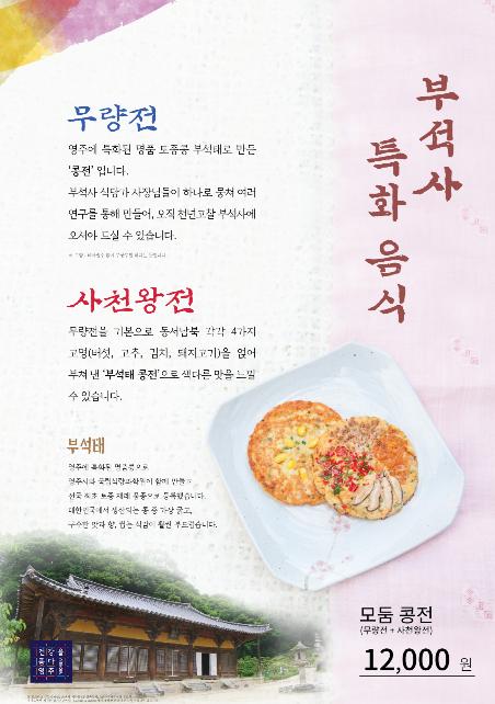 ‘무량전’과 ‘사천왕전’은 모둠전으로 판매되며 판매 가격은 12,000원으로 판매 업소는 부석사 집단시설지구내 자미가, 부석사식당, 부석사종점식당, 평화식당, 명성식당 등 5개 업소이다.