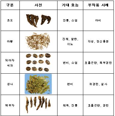 √ 진통 효과를 위해 ‘초오’를 섭취하였다가 호흡곤란 √ 다이어트 등의 효과를 위해 ‘마황’ 을 섭취하였다가 경련, 정신 흥분 √ 소화기 장애 등 증상 완화를 위해 ‘피마자 씨앗’을 섭취한 후 위장출혈 및 저혈압, 호흡 곤란 √ 변비증상 완화를 위해 ‘센나’를 섭취한 후 위경련, 설사 등