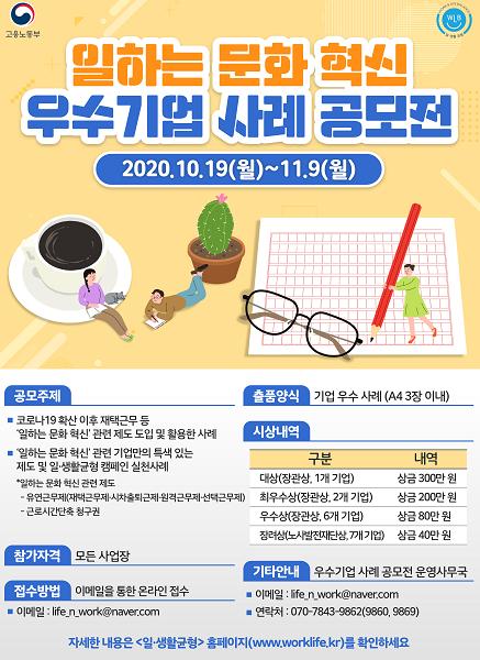 이번 공모전 주제는 ① 코로나19 확산 이후 재택근무 등 일하는 문화 혁신 제도를 도입 및 활용한 사례, ② 일하는 문화 혁신과 관련된 기업만의 특색 있는 제도 및 일·생활 균형 캠페인 실천사례이다.