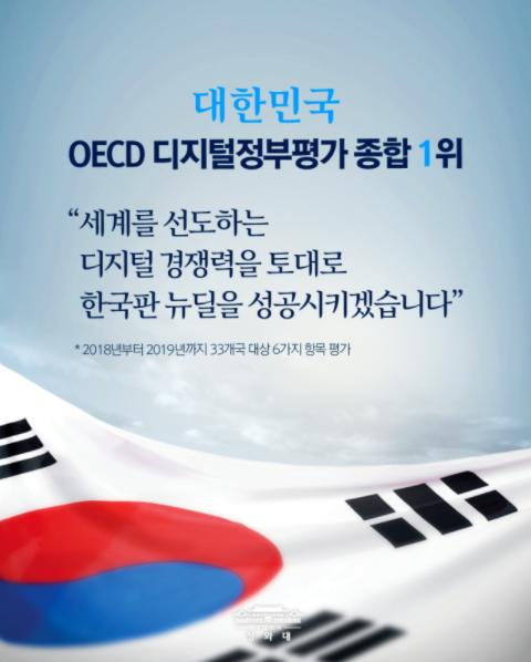 [한국4차산업신문] 청와대 강민석 대변인은 16일 브리핑을 통해 "한국이 OECD 디지털정부 평가에서 총 33개의 나라 중 1위를 차지했다"고 밝혔다. 아울러 "2위에서 5위까지는 영국, 콜롬비아, 덴마크, 일본 순"이며 "여러 가지로 의미 있는 결과라고 생각한다"고 말했다.