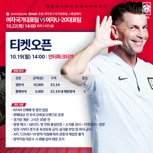 오는 22일 오후 2시 파주스타디움에서 열리는 ‘신세계 이마트 후원 여자축구국가대표팀 스페셜매치’ 여자국가대표팀vs.여자U-20대표팀의 티켓이 19일 오후 2시부터 인터파크티켓을 통해 판매된다. 모바일 티켓만 판매되며 가격은 일반석 1만원, 휠체어석 5000원이다. KFAN 선예매 및 할인 혜택은 이번 경기에는 적용되지 않는다.