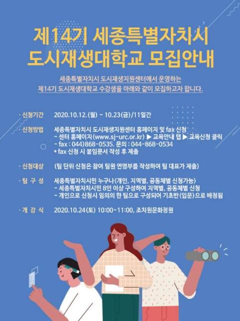 한편, 개강식은 24일 오전 10시 조치원 문화정원에서 열릴 예정이다. 도시재생대학은 2013년 1기를 시작으로 지난 13기까지 총 2,020명의 수료생을 배출한 바 있다.