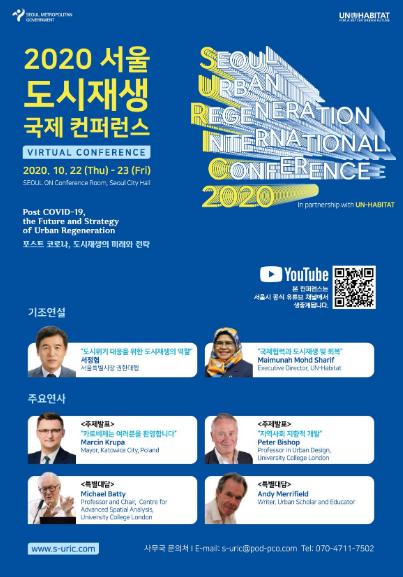 [한국4차산업신문] 서울시가 ?포스트 코로나, 도시재생의 미래와 전략(Post COVID-19, the Future and Strategy of Urban Regeneration)?을 주제로 한 ‘2020 서울 도시재생 국제 컨퍼런스’를 10.22(목)~23(금) 양일 간 개최한다. 온라인 화상회의로 진행되며, 서울시 공식 유튜브 채널(국·영문)을 통해 실시간 생중계된다.