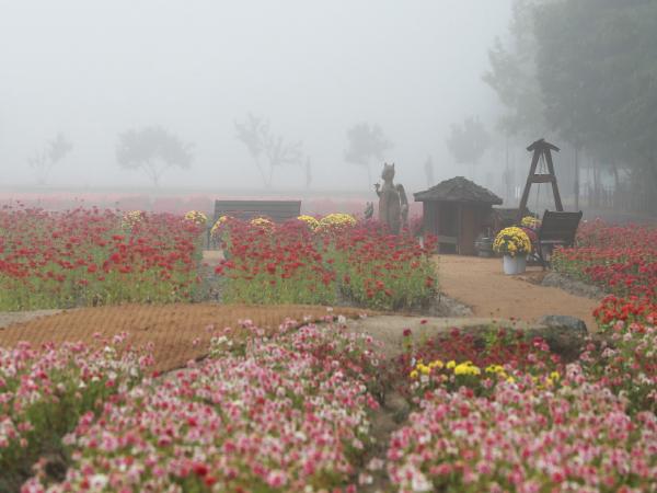 [한국4차산업신문] 가을이 깊어가고 있다. 절기상 상강을 하루 앞둔 22일 오전 경남 함양군 상림공원 꽃밭에 안개가 자욱하게 깔려 있다.